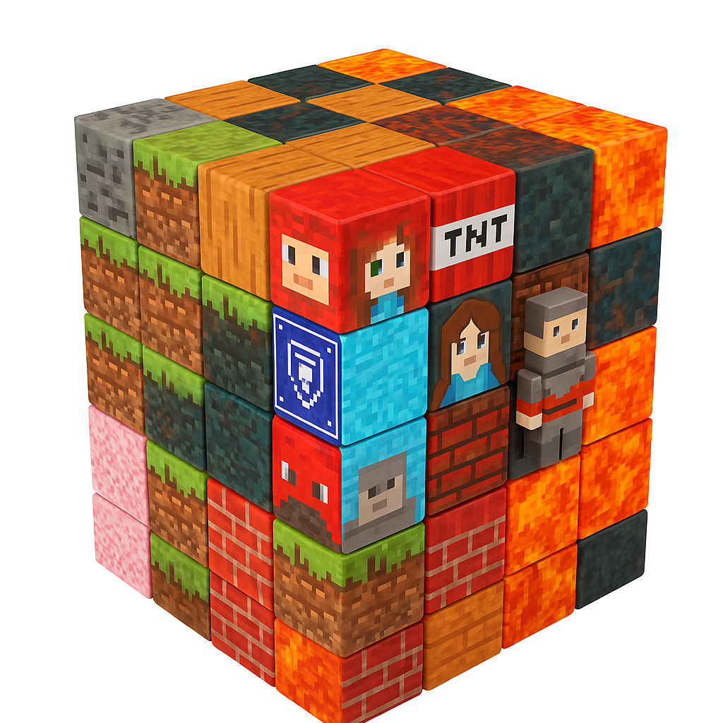 Zestaw zawiera 500 kostek magnetycznych z tematycznymi nadrukami (trawa, cegła, drewno, kamień, „woda”, „lawa”, elementy dekoracyjne). Dzięki magnesom konstrukcje są stabilne, a zmiany robi się w kilka sekund. Układ „piramida” na zdjęciu głównym podkreśla ilość i kolory elementów, a także nadaje się na efektowną ekspozycję pokoju dziecka.