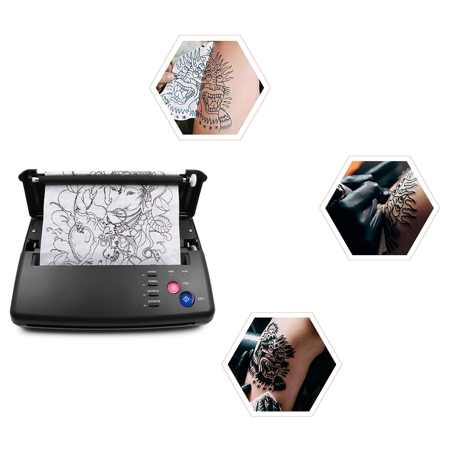 2. BEZBŁĘDNA PRECYZJA – KAŻDA LINIA MA ZNACZENIE Zapomnij o drżących liniach czy utraconych detalach. Kopiarka termiczna przenosi Twój oryginalny projekt na kalkę z cyfrową dokładnością. Każdy, nawet najdrobniejszy szczegół Twojego rysunku, zostanie wiernie odwzorowany, co jest fundamentem perfekcyjnego tatuażu.