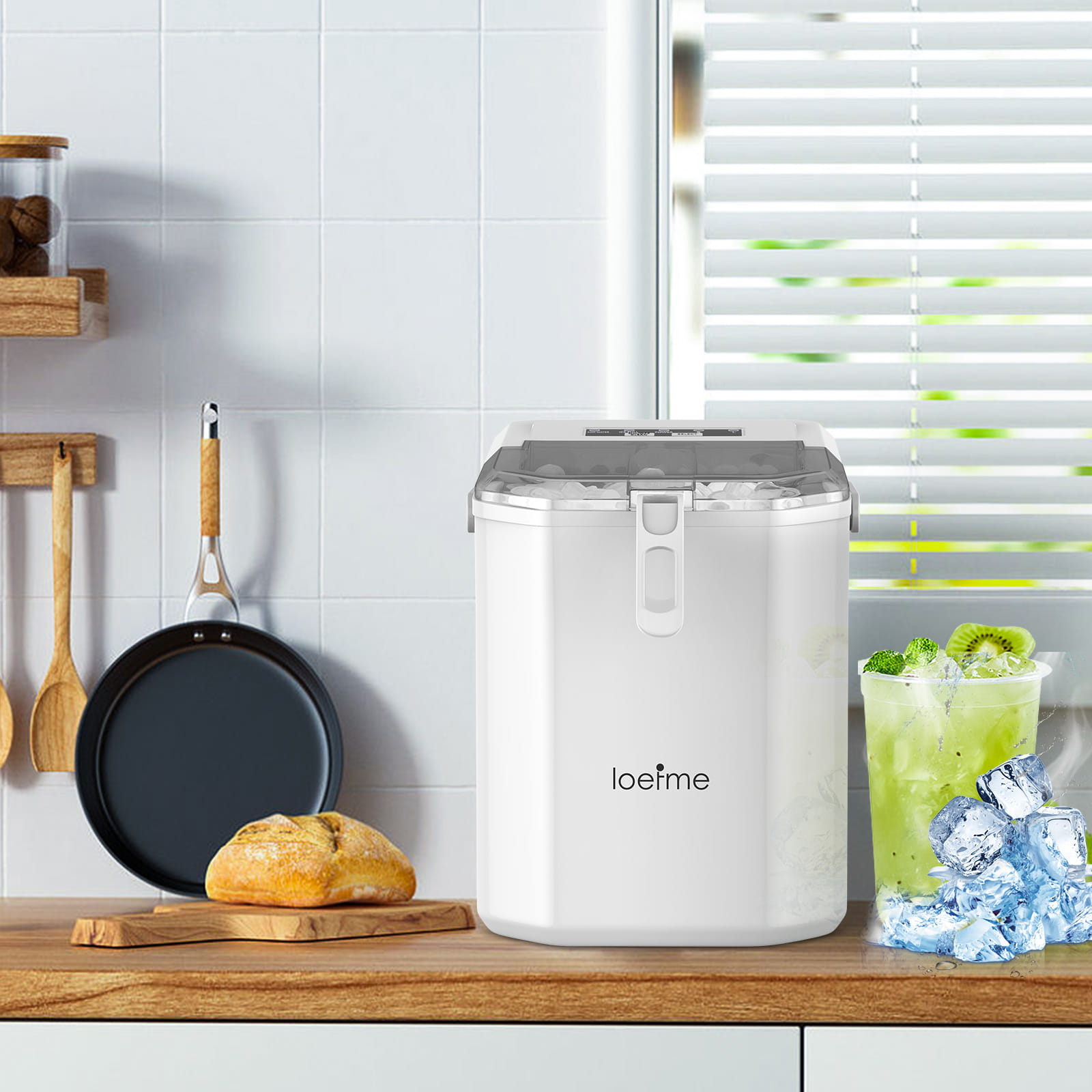 KOMPAKTOWY I STYLOWY DESIGN Nowoczesny, minimalistyczny wygląd w białym kolorze sprawia, że kostkarka jest nie tylko funkcjonalna, ale też stanowi elegancki dodatek do każdego wnętrza. Zmieści się na każdym blacie kuchennym.