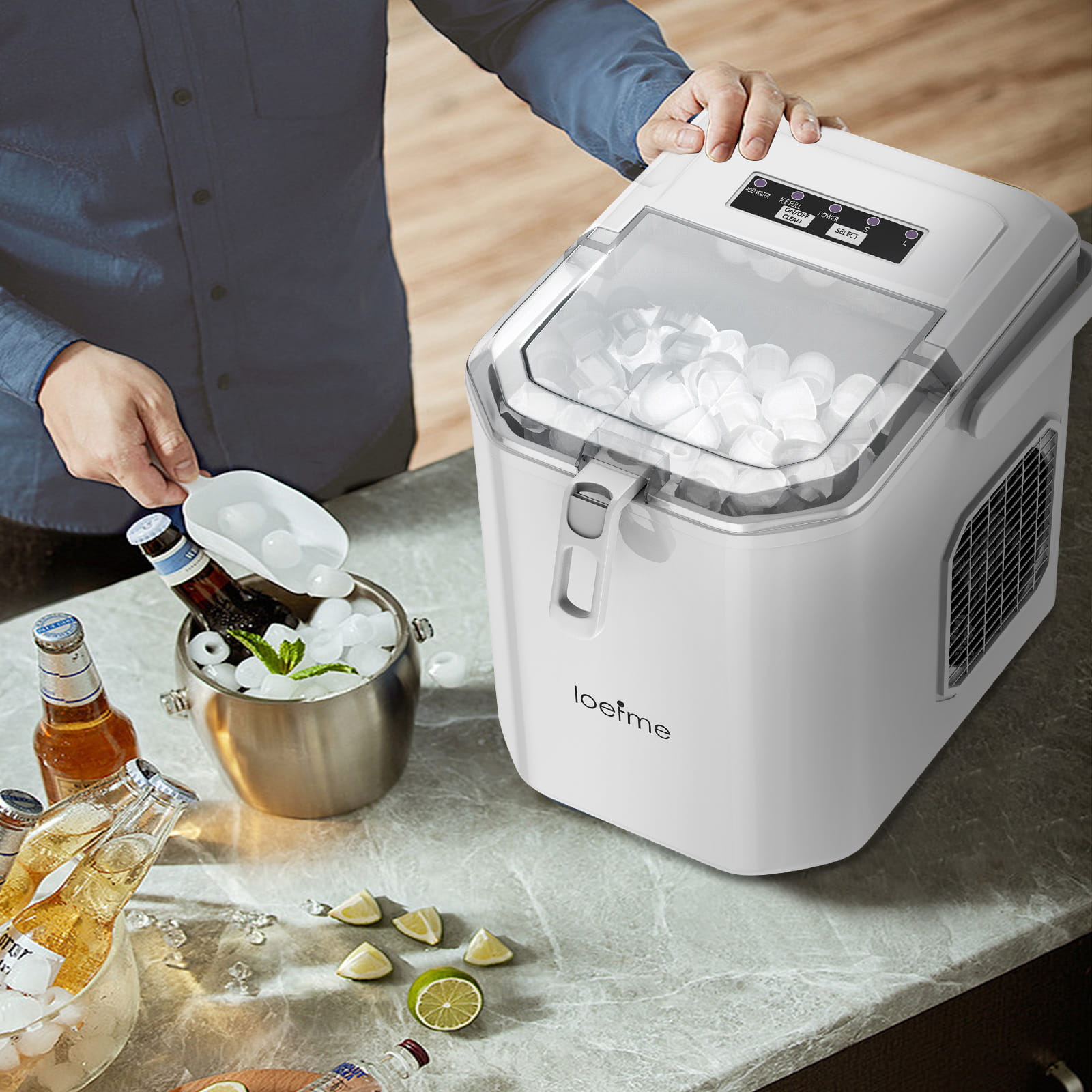 NIEZWYKLE PROSTA OBSŁUGA Wystarczą 3 kroki: wlej wodę do zbiornika, włącz urządzenie jednym przyciskiem i gotowe! Intuicyjne wskaźniki LED poinformują Cię, gdy koszyk na lód będzie pełny lub gdy będzie trzeba uzupełnić wodę.